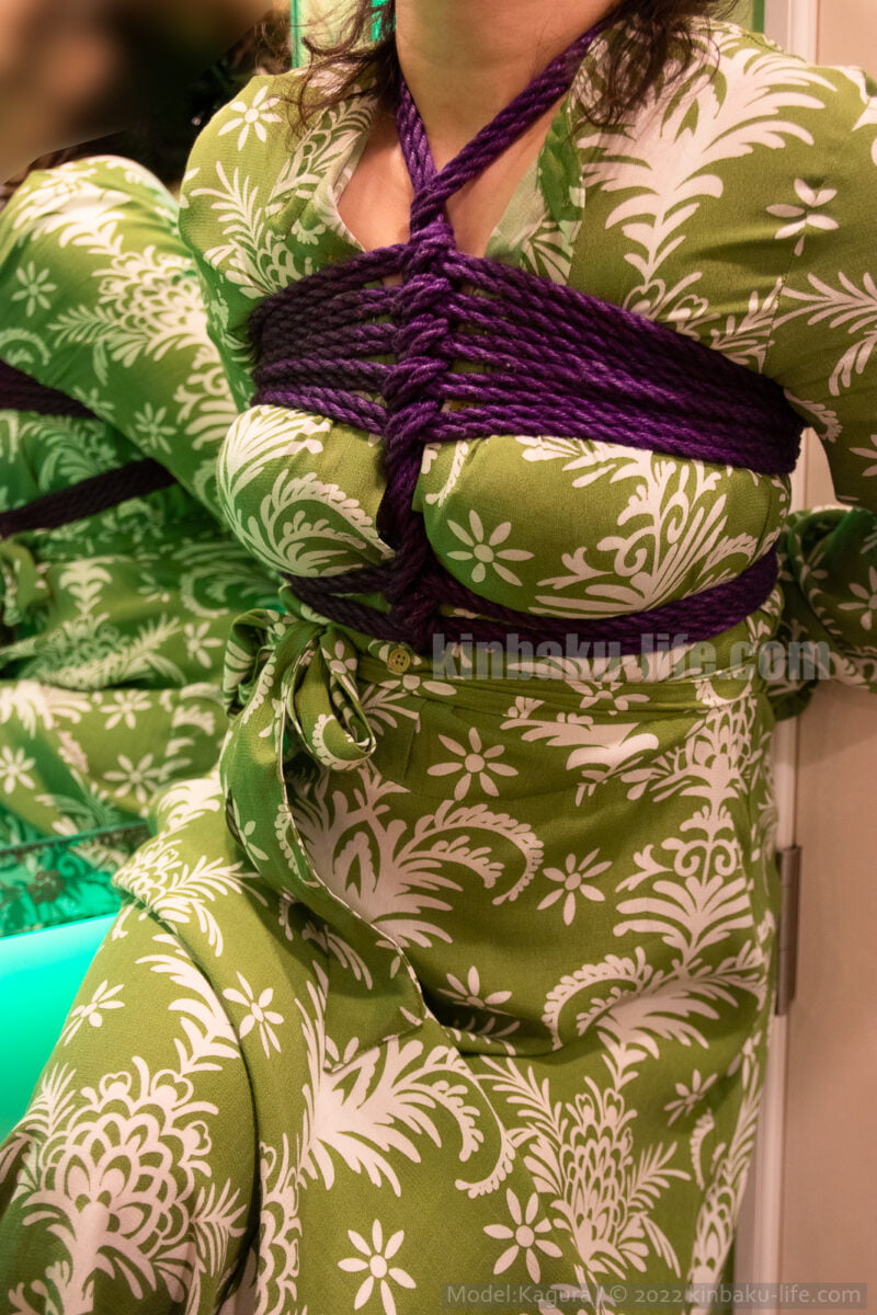 緊縛の基本となる縛りで、後ろで組んだ手を縛り胸の上下に縄を回し胸の間にバッテン、もしくは山成りに縄を回します。かなり拘束感があります。