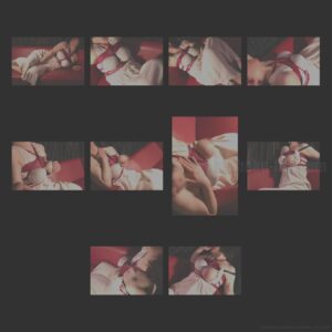 白いワンピースに包まれた体を、赤い縄と赤いソファが引き立てた写真です