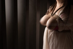 白いブラウスに包まれた胸元を、生成りの縄で強調した写真です